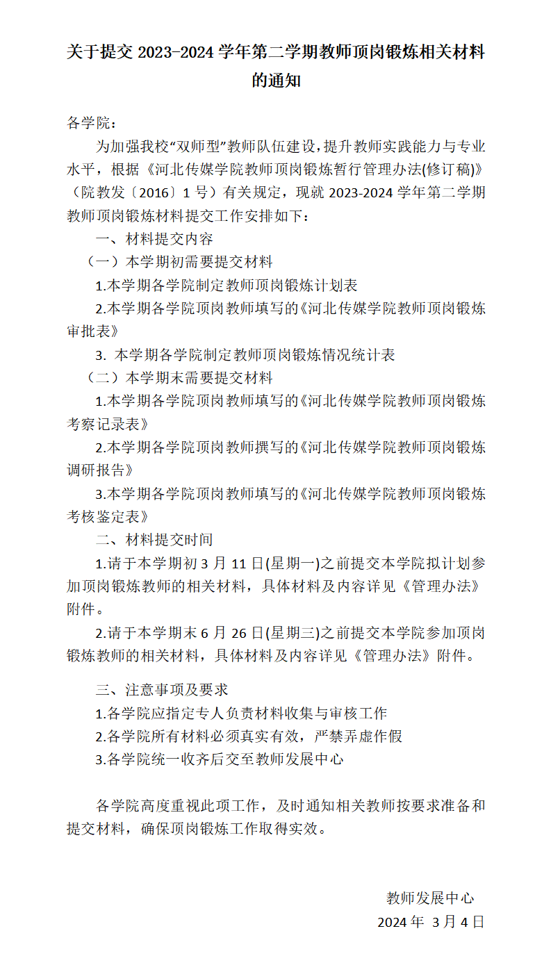 2023-2024学年第二学期提交顶岗锻炼材料通知