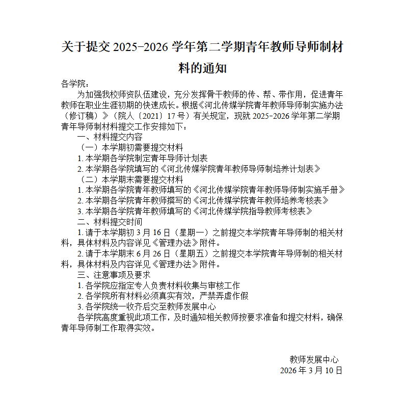关于提交2025-2026学年第二学期青年教师导师制材料的通