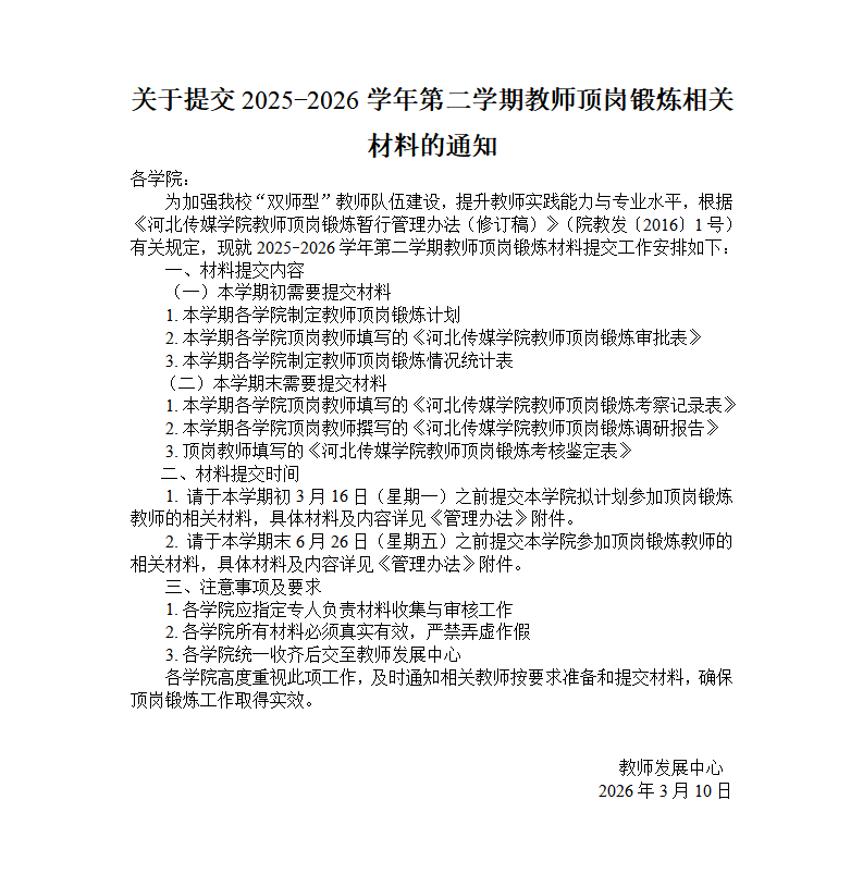 关于提交2025-2026学年第二学期教师顶岗锻炼相关材料的通知